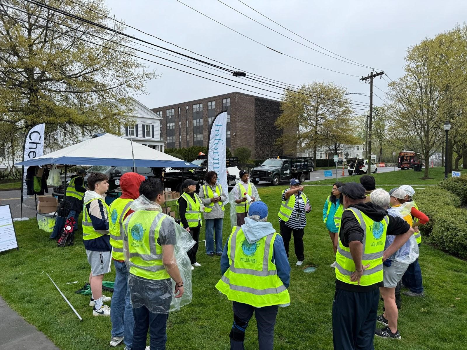Earth Day event staff in neon green vests circle around to kick off the day